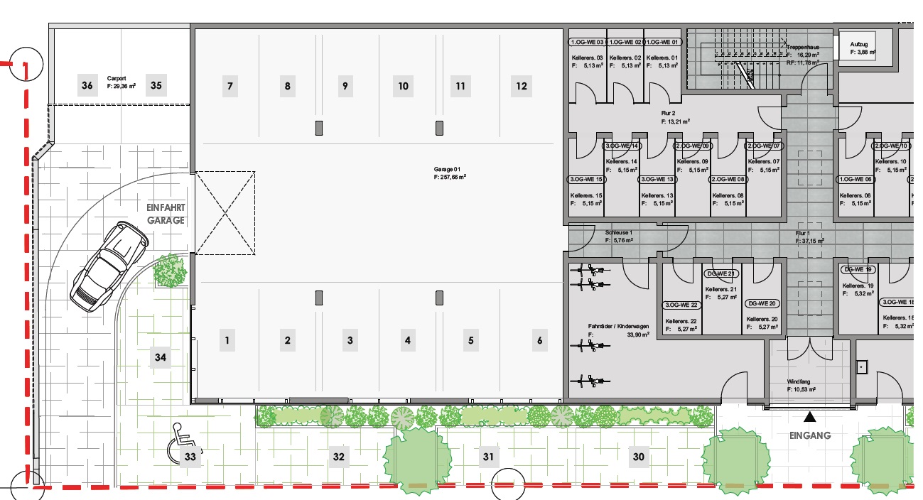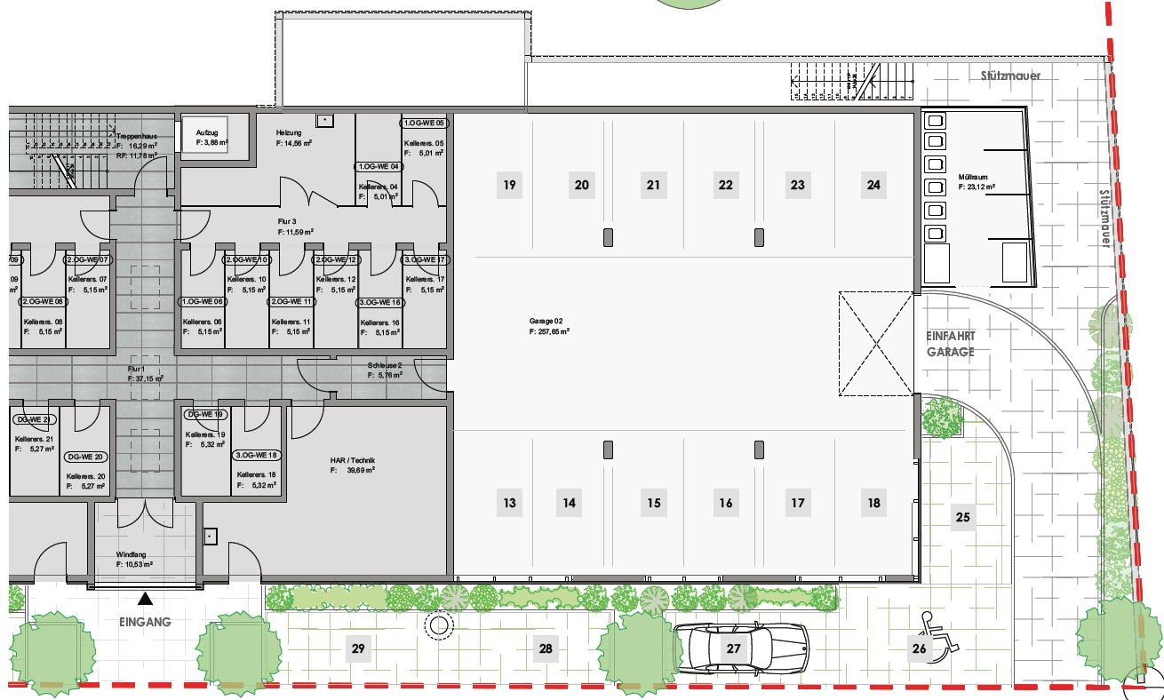 Im Kellergeschoss befindet sich eine Tiefgarage mit 24 Stellplätzen. Ebenfalls im Kellergeschoss finden sich 22 Kellerräume und ein Fahrradraum. Die Tiefgarage wird per Aufzug mit den Wohngeschossen verbunden. 10 weitere Außenstellplätze, u.a. behindertengerecht, befinden sich vor dem Haus.